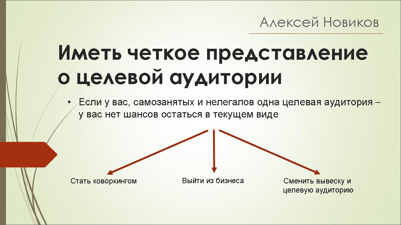 Завершает наш мини-отчет о мероприятии слайд из презентации Алексея Новикова. И действительно, если у вас с самозанятыми (ну и заодно с нелегалами) одна целевая аудитория, то либо вы кардинально меняетесь, либо модифицируетесь в коворкинг (желательно, настоящий) или уходите с рынка (и, если это сделать вовремя (то есть сейчас), то можно полностью вернуть свои инвестиции).